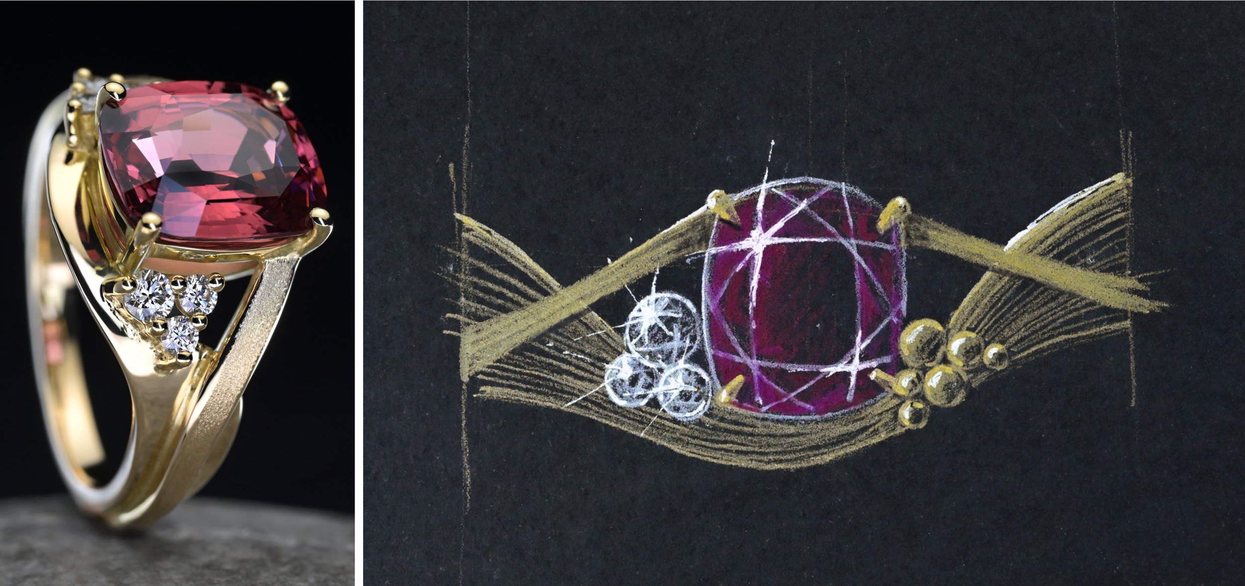Pierres, couleurs, formes, textures, teintes d’or : tout est envisagé à travers un dialogue attentif. Christine perçoit peu à peu la personnalité de la future épouse et la nature du lien qui unit le couple. Croquis à l’appui, réalisés sous les yeux du client, elle guide les choix et fait émerger la symbolique que la bague devra porter. La création se construit ainsi à quatre mains, jusqu’à devenir le reflet intime de leur histoire. "Pour moi, ce sont les bagues qui portent le plus de messages", confie-t-elle.