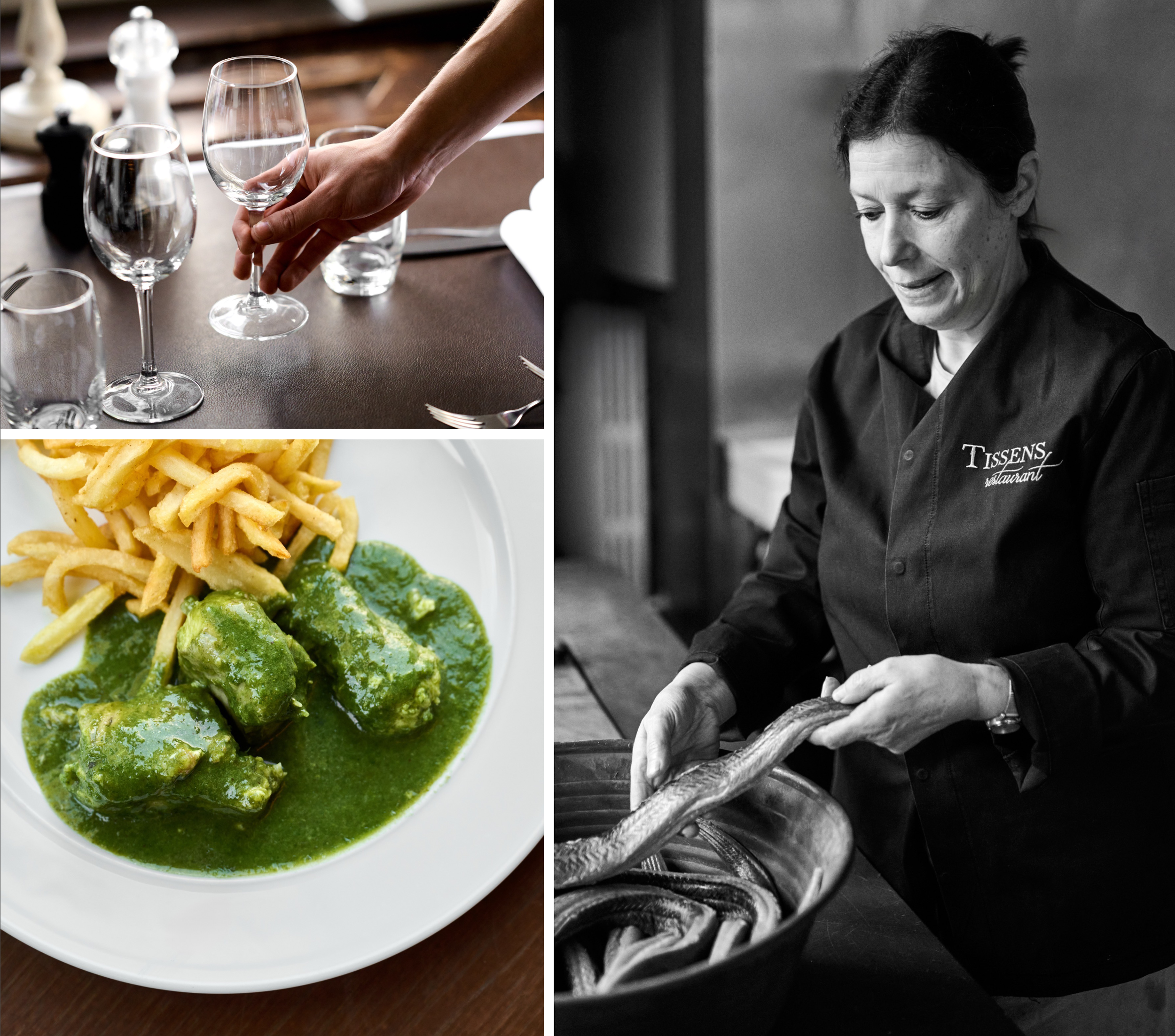 's Middags of 's avonds beginnen de meesten met de beroemde paling in 't groen, bereid volgens een recept dat al meer dan zeventig jaar geheim wordt gehouden. Daarna volgt de côte à l'os, die wordt aangesneden in de eetzaal en geserveerd met zelfgesneden, in ossewit gebakken frietjes. "We hebben ook andere gerechten, zoals garnalen- en kaaskroketten, maar klanten kiezen toch vooral voor de paling in 't groen en de côte à l'os." We snappen meteen wat de jonge eigenaar bedoelt: het is geruststellend, gemakkelijk zelfs, om te weten dat we niet kunnen missen met onze keuze.