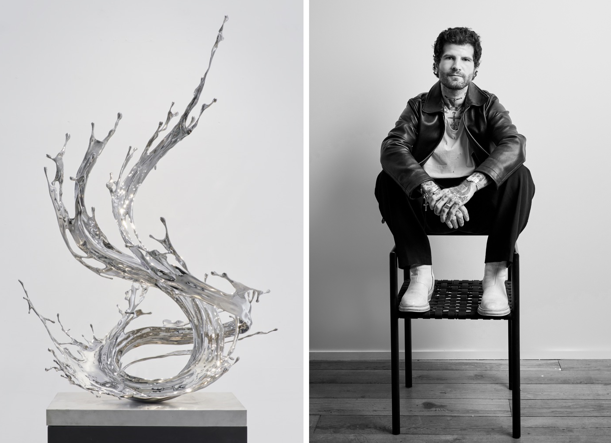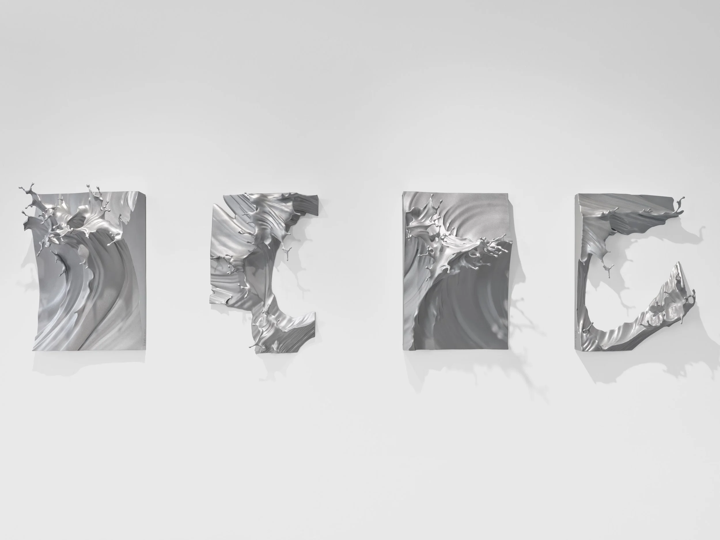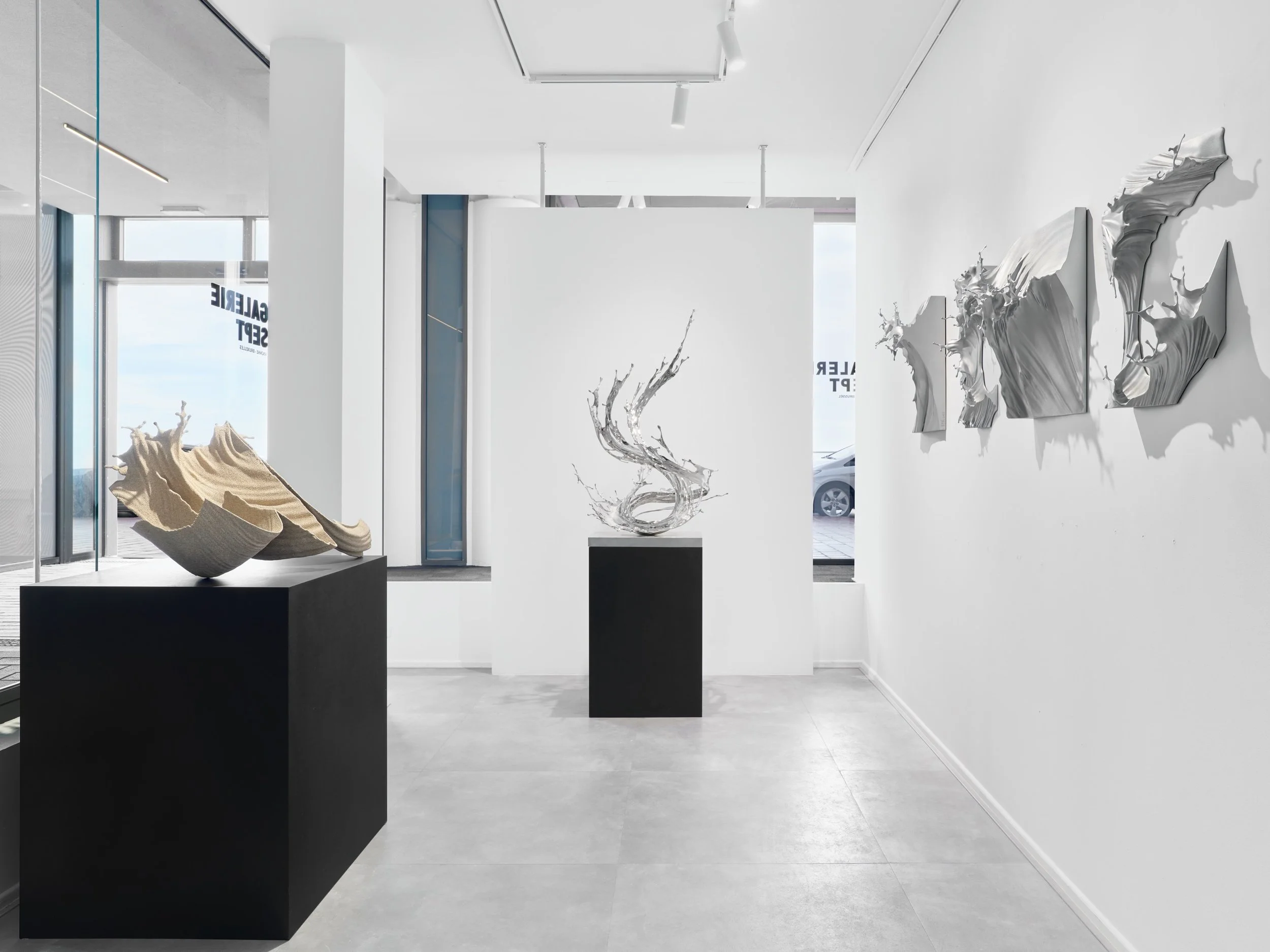 Reconnu pour sa maîtrise exceptionnelle de l’acier poli miroir, Zheng Lu réalise des sculptures en acier inoxydable 316 de qualité marine, qui semblent flotter dans l’espace, suspendues hors du temps. Tantôt murales, tantôt présentées sur socle, ces formes évoquent des vagues figées ou des éclaboussures arrêtées dans leur mouvement. Chaque œuvre est composée de centaines de petits moules assemblés et retravaillés avec une patience extrême, dans un processus où se rencontrent tradition, exigence technique et virtuosité artisanale. Le matériau réfléchissant capte la lumière, l’environnement et les mouvements du spectateur, inscrivant l’œuvre dans une expérience vivante et évolutive en échos à la mémoire du temps.